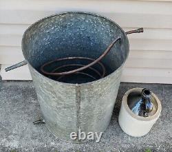 Original pre prohibition galvanized bucket distiller w/ copper coil. Includes a period correct stoneware whiskey jug which makes for a great display!