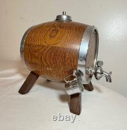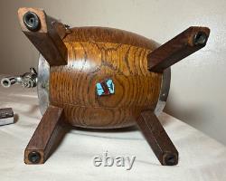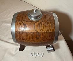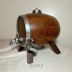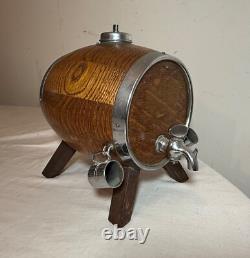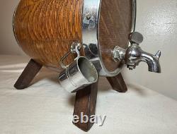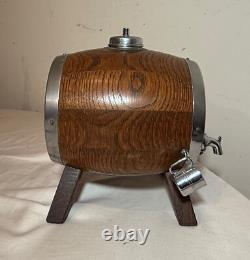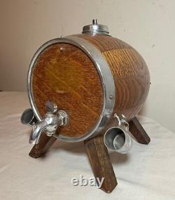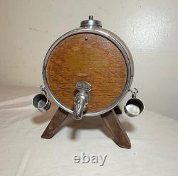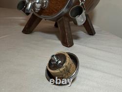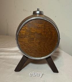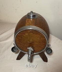 The antique wood and nickel plated wine barrel shaped moon shine dispenser is a unique and rustic shot dispenser crafted from wood, with nickel plated bands. Dating back to the early 20th century, this original piece exudes a sense of history and charm. Perfect for serving up shots of your favorite spirits, this vintage decanter dispenser adds a touch of old-world elegance to any home bar or collection of antiques. It some with two miniature nickel lated cups hanging from the side, is nicely footed, and a removable cork at the top. Condition and measures 8 inches long by 8 inches tall by 7 inches wide. Thank you for visiting "Dusty Treasures " and please feel free to browse through.