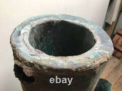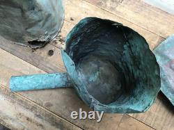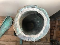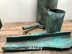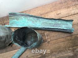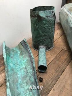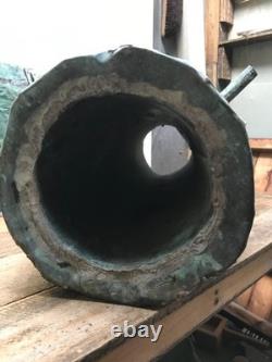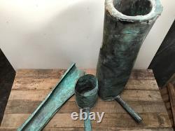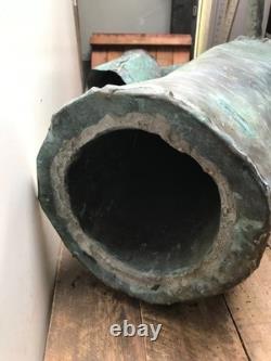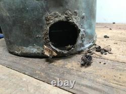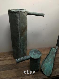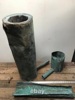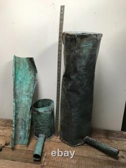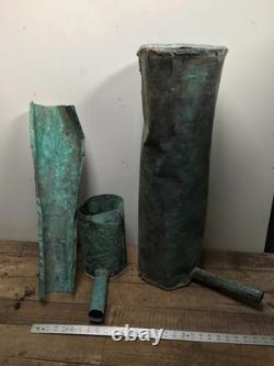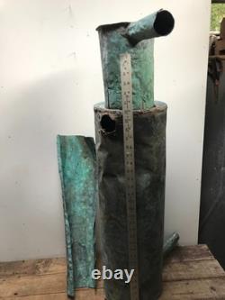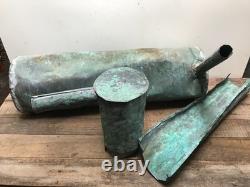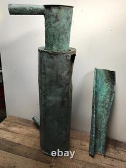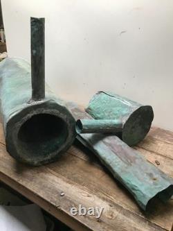 SIZE: boiler is 30" long x 9" dia. The cap is 11" long x 6" dia. With a 7" neck and the trough is 25" long. All dented up and covered with verdigris. A lot of debris came out of the thumper but still more in there.